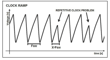 如果石英振蕩器有噪聲感應(yīng)電壓在上升坡道上的尖峰,門檻將被越過早些時(shí)候,時(shí)鐘信號(hào)會(huì)比它早應(yīng)該,如圖所示,這也將提前開始低坡道在圖中,這導(dǎo)致切換的突然變化PWM信號(hào)的頻率和高抖動(dòng),該時(shí)鐘斜坡非常容易受到PCB布局的影響芯片周圍的元件,因此,除非開關(guān)頻率在內(nèi)部產(chǎn)生,易受影響蝕刻和元件會(huì)引入噪聲額外的抖動(dòng),這種行為可以避免,或者至少可以避免通過遵循適當(dāng)?shù)腟MPS布局規(guī)則最小化.