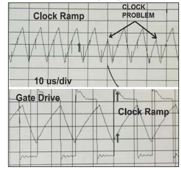 圖中顯示了一個(gè)早期時(shí)鐘斜坡復(fù)位事件真正的SMPS設(shè)計(jì),上圖顯示了早期時(shí)鐘斜坡由于噪聲而復(fù)位,而數(shù)字較低說明了由于操作導(dǎo)致的早期時(shí)鐘斜坡復(fù)位接近最大占空比,CIP解決方案不受早期時(shí)鐘斜坡的影響重置,因?yàn)闀r(shí)鐘是使用內(nèi)部創(chuàng)建的分頻器鏈產(chǎn)生定時(shí),和振蕩器由穩(wěn)定的帶隙參考偏置和供電,即使高峰值也能觸發(fā)早期時(shí)鐘斜坡復(fù)位,它仍然是32MHz,這意味著可能的抖動(dòng)小于0.1%. 傳統(tǒng)解決方案與CIP解決方案MCU不受布局或最大負(fù)載的影響關(guān)于抖動(dòng)的周期限制,因此,脈沖會(huì)有一個(gè)準(zhǔn)確的恒定頻率,使用一個(gè)采用SMPS專用CIP的MCU消除了IC相關(guān)問題從設(shè)計(jì)和提供穩(wěn)定性問題應(yīng)用靈活性,OSC晶振抖動(dòng)是切換方式所固有的生成頻率,可以注意到它很小PWM信號(hào)的頻率變化,振蕩器抖動(dòng)限制最大占空比,作為短期變化頻率可以在關(guān)閉時(shí)間內(nèi)產(chǎn)生很大的變化高占空比設(shè)計(jì).