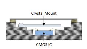 使用硅MEMS技術可以在同一芯片上制造定時陶瓷諧振器和溫度傳感器。使用傳統的石英晶體組裝工藝不可能同時振制造諧振器和溫度傳感器。石英TCXO的封裝,材料和性能限制需要晶體和溫度傳感器之間的大位移。石英傳感器需要對石英坯料進行細致的加工,拋光和修整,以在整個溫度范圍內實現所需的頻率穩定性,而CMOS IC上的振蕩器電路,溫度傳感器和補償電路使用傳統的硅微加工技術制造。將這兩個基于兩種不同材料系統的組件集成在一起會帶來許多挑戰。石英換能器通常使用導電粘合劑安裝在陶瓷封裝中,使得其用環境氮氣懸浮在封裝腔中。晶體通過鎢通孔和金線鍵合電連接到CMOS IC,CMOS IC安裝在封裝的底部。圖3a顯示了一體化石英晶體振蕩器陶瓷封裝的橫截面示意圖3b頂蓋上安裝有石英晶體的去蓋部分和3c與石英晶體相同的部分移除后,顯示CMOS IC,溫度傳感器,振蕩器和補償電路安裝在封裝底座上的晶體下方。
