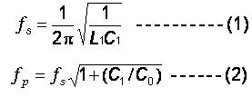 在評估共振時的等效線路時, 串聯(lián)諧振頻率及并聯(lián)諧振頻率, fr and fa ,是最重要的二個頻率參數(shù). 對于串聯(lián)諧振頻率及并聯(lián)諧振頻率( fs and fp )二者的關(guān)系, 我們可以用下列公式來表達(dá):