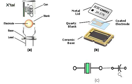 圖中(a)及(b)分別是DIP型式及SMD型式的石英振蕩子的基本結構圖. 圖中(c)是電子電路上所使用代表石英振蕩子的電子符號. 當石英晶體共振子處在遠離振蕩頻率區域時, 石英晶體共振子僅是一個電容性的組件, 當頻率接近石英晶體的振蕩頻率時, 就接近是一個電感性的等效LCR振蕩線路.