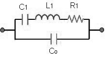 下圖就是將石英晶體共振子轉換成振蕩頻率附近的Butterworth-Van Dyke (BVD)等效電路. 在這個圖中, 有四個主要參數 : 靜態電容-Co, 動態電容-C1, 動態電感-L1及動態電阻-R1.