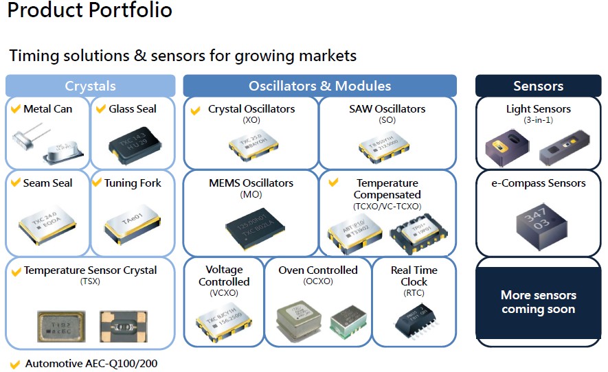 臺灣晶技為一專業之頻率組件與感測組件供貨商,自1983年成立以來,始終致力于石英晶體相關諧振器(Crystal)、振蕩器(Oscillator) 等頻率組件之研發、設計、生產與銷售,并因應市場應用與需求.產品"9C-16.000MAAJ-T"被廣泛應用到電子數碼產品,衛星GPS導航,智能電腦,智能手機等產品.月產量8000萬只,成為同行業中的佼佼者,產品遠銷西歐一帶國家,巴西,中國香港,大陸,中國臺灣等全球市場.