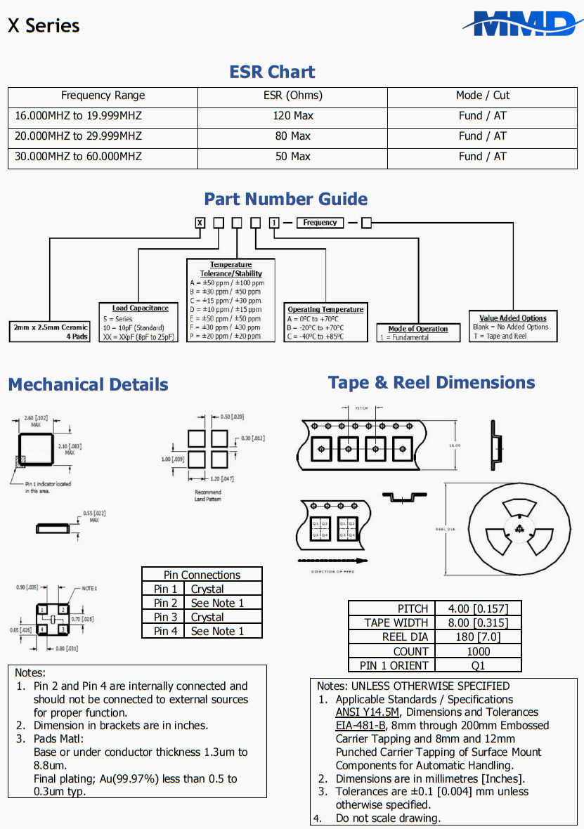 麥迪康超小型晶振,2520進口晶振,X20AB1-16.000MHZ-T電腦主板晶振,美國MMD晶振公司,X系列晶振,X20AB1-16.000MHZ-T晶振,貼片晶振,石英晶振,歐美晶振,超小型晶振,四腳晶振,超小型晶振,高精度晶振,汽車晶振,2520晶振, 耐高溫晶振,無源晶振,液晶儀表盤晶振,進口晶振,歐美晶振,超小型晶振,電腦主板晶振,無源晶振,顯示器晶振,環保無鉛晶振,MMD晶振。2mm x 2.5mm 4襯墊陶瓷包裝,超微型輪廓,符合RoHS標準,磁帶和卷軸包裝。