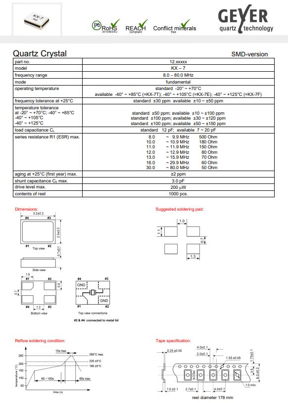 | 12.88508 | GEYER | Crystal 24.0Mhz 12pF SMD | KX-7T | ±20ppm | -40°C ~ 85°C | 4 | 3225 | Geyer Electronic America, Inc. |