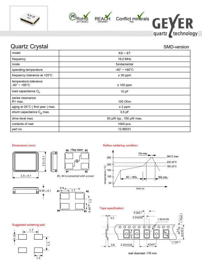 | 12.86531 | GEYER | Cystal 16.0Mhz 10pF SMD | KX-6T | ±30ppm | -40°C ~ 85°C | 4 | 2520 |