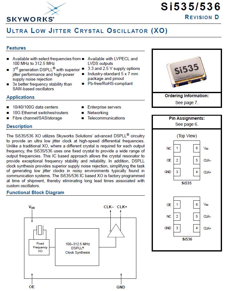 編碼536BB156M250DG,頻率為156.25MHz,Si535/536 XO時鐘振蕩器,OSC石英晶體振蕩器,采用Skyworks Solutions先進(jìn)的DSPLL®電路在高速差分頻率下提供超低抖動時鐘。不像傳統(tǒng)的XO,每個輸出都需要不同的晶體頻率,Si535/536使用一個固定晶體提供廣泛的輸出頻率。這種基于集成電路的方法允許晶體諧振器提供卓越的頻率穩(wěn)定性和可靠性。此外,DSPLL時鐘合成提供了優(yōu)越的電源噪聲抑制,簡化了任務(wù)在嘈雜的環(huán)境中產(chǎn)生低抖動時鐘的方法通信系統(tǒng)。基于Si535/536 IC的XO是工廠編程的在發(fā)貨時,從而消除了較長的交貨時間定制的振蕩器。