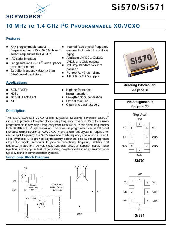 更多>>570DCA001230DG美國思佳訊Skyworks差分晶振7050八腳10M