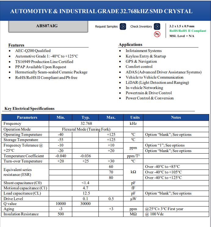 隨著行業(yè)的需求增長,艾博康公司推出編碼ABS07AIG-32.768KHZ-9-1-T無源晶振,符合AEC-Q200標準 汽車1級:-40°C至+125°C TS16949生產(chǎn)線認證 PPAP可應要求提供 氣密接縫密封陶瓷封裝 符合RoHS/RoHS II標準,無鉛.應用程序 信息娛樂系統(tǒng) 無鑰匙進入和啟動GPS和導航,舒適控制 ADAS(高級駕駛輔助系統(tǒng)),車輛對車輛通信,激光雷達(光探測和測距) 車載網(wǎng)絡,動力系統(tǒng)和驅(qū)動控制,電源控制和轉(zhuǎn)換.