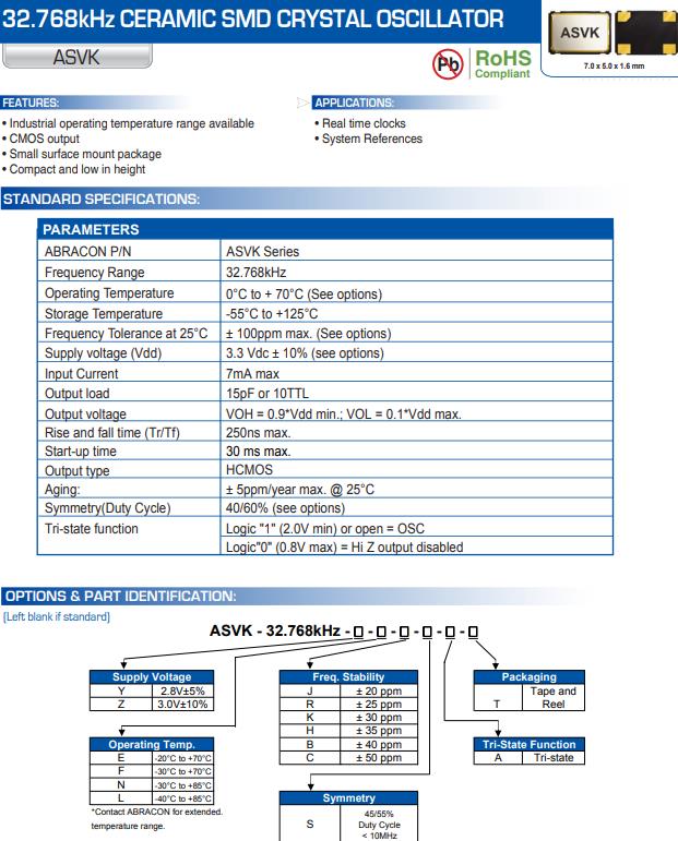 | ASVK-32.768KHZ-LJT | Abracon晶振 | ASVK | XO (Standard) | 32.768K晶振 | 3.3V | -40°C ~ 85°C |