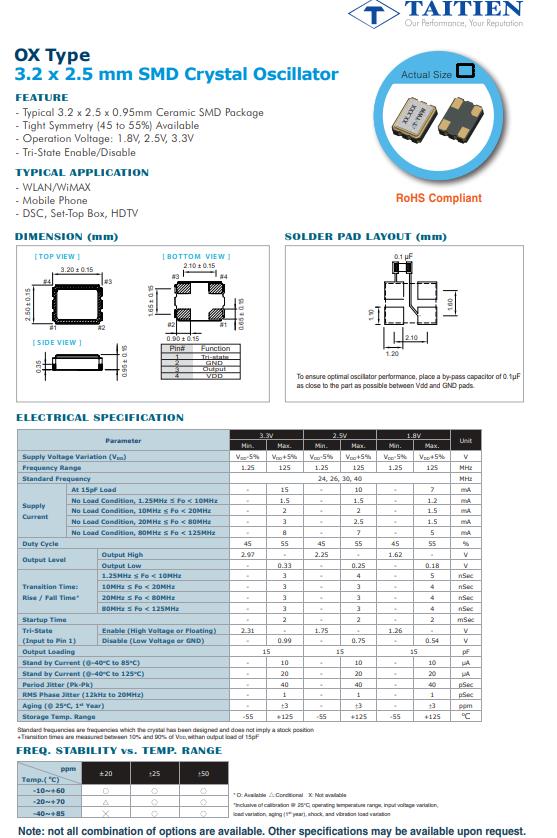 | OXETDLJANF-25.000625 | Taitien | OX | XO (Standard) | 25.000625MHz | 3.3V |