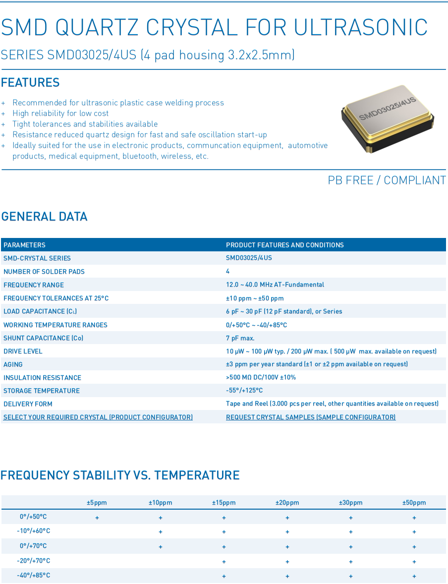 “SMD03025/4US”的頻率范圍為12-40 MHz,在+25°C時(shí),頻率公差從±10 ppm開(kāi)始,在-20/+70°C的溫度范圍內(nèi),溫度穩(wěn)定性從±10 ppm開(kāi)始。在工業(yè)溫度范圍-40/+85°C之外,最接近的溫度穩(wěn)定性為±15 ppm。