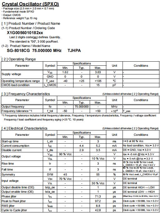 | X1G005601018200 | SG-8018CG | 75.000000 MHz | 2.50 x 2.00 x 0.80 mm | CMOS | 1.620 to 3.630 V | -40 to 105 °C | +/-50 ppm |