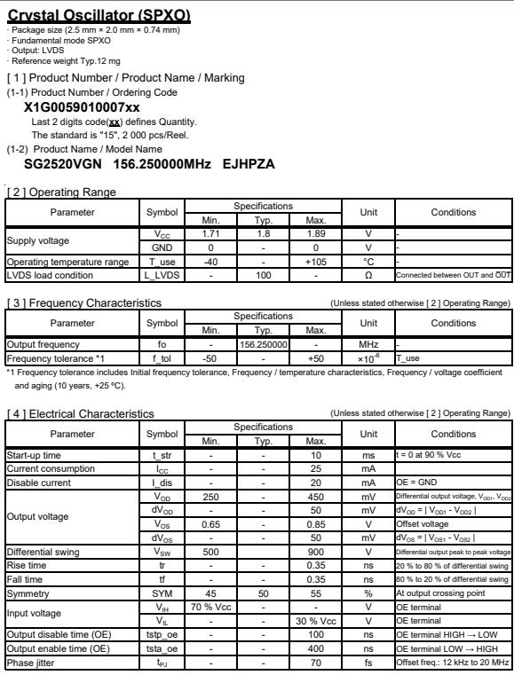 | X1G005901000615 | SG2520VGN | 156.250000 MHz | 2.50 x 2.00 x 0.84 mm | LVDS | 2.375 to 2.625 V | -40 to 85 °C | +/-50 ppm | ≤ 25.0 mA |