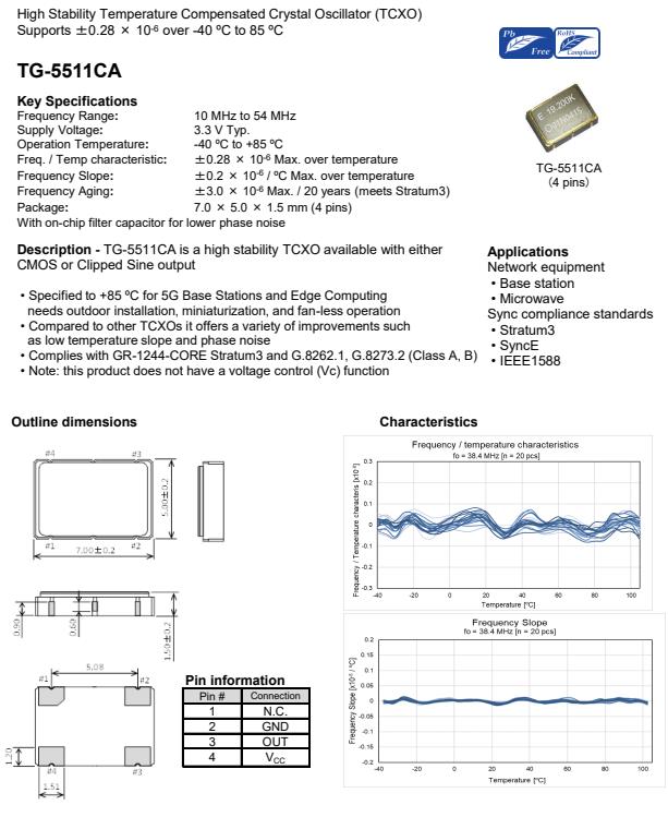 | X1G006011008014 | TG-5511CA | 48.000000 MHz | 7.00 x 5.00 x 1.50 mm | Clipped sine wave | 3.135 to 3.465 V | +/-1.0 ppm | -40 to +85 °C |