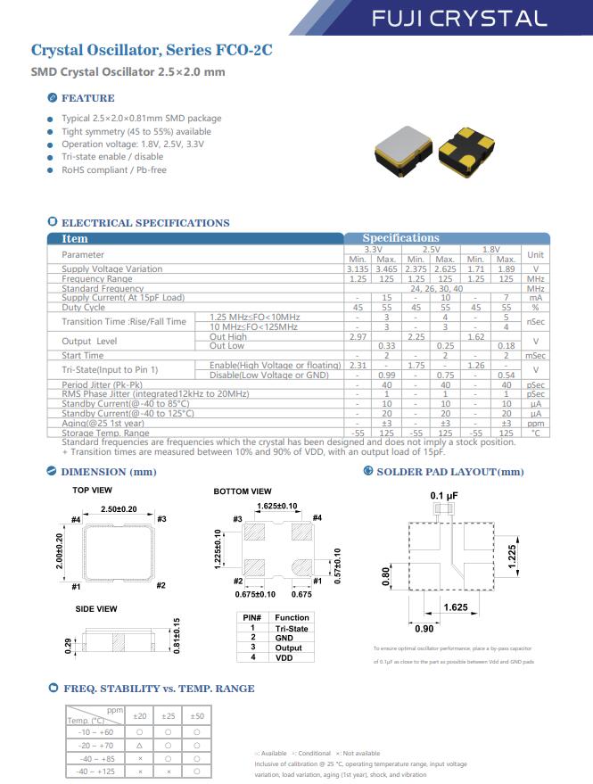 | FCO2C03300018CFE00 | Fuji 有源晶振 | XTAL OSC XO 33.000MHZ CMOS SMD | FCO-2C | 1.8V | ±50ppm | -20°C ~ 70°C | 4腳 | 2520 |
